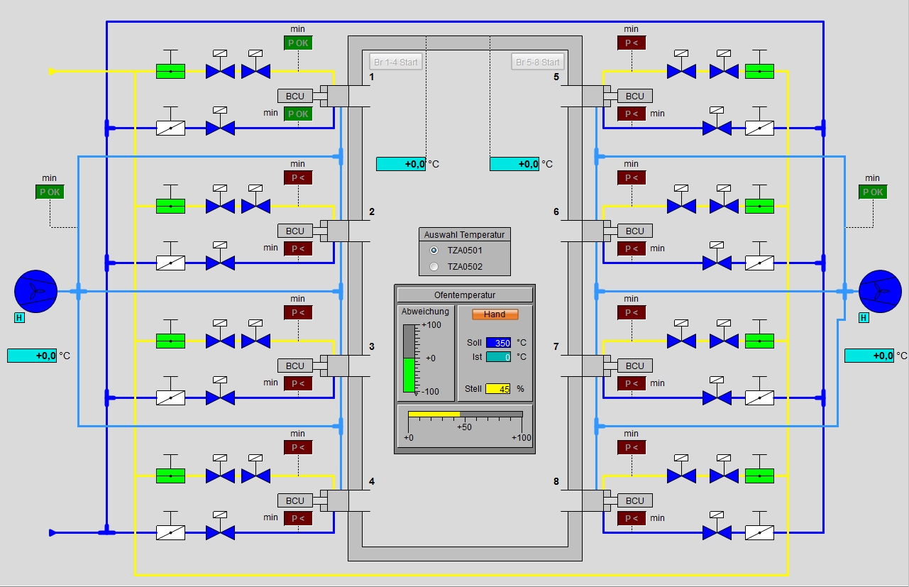 Im Rahmen eines Projektes Energieeffizienz wurden 3 Stück Warmhalteöfen für Brammen im Warmbandwerk von Erdgas auf Koksgas umgestellt. Bei dem Umbau mussten unbedingt die Anforderungen aus der Norm DIN EN 746-2 Industrielle Thermoprozessanlagen - Teil 1 und Teil 2: Sicherheitsanforderungen an Feuerungen und Brennstoffführungssysteme beachtet werden. Die vorhandene Hardware Steuerung und Regelung der Öfen wurde durch eine neue fehlersichere speicherprogrammierbare Steuerung je Ofen ersetzt. Für die Bedienung und Beobachtung der drei Öfen wurde ein redundantes WinCC Serverpaar installiert.